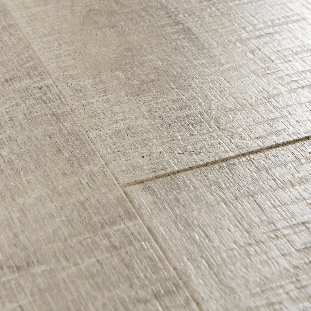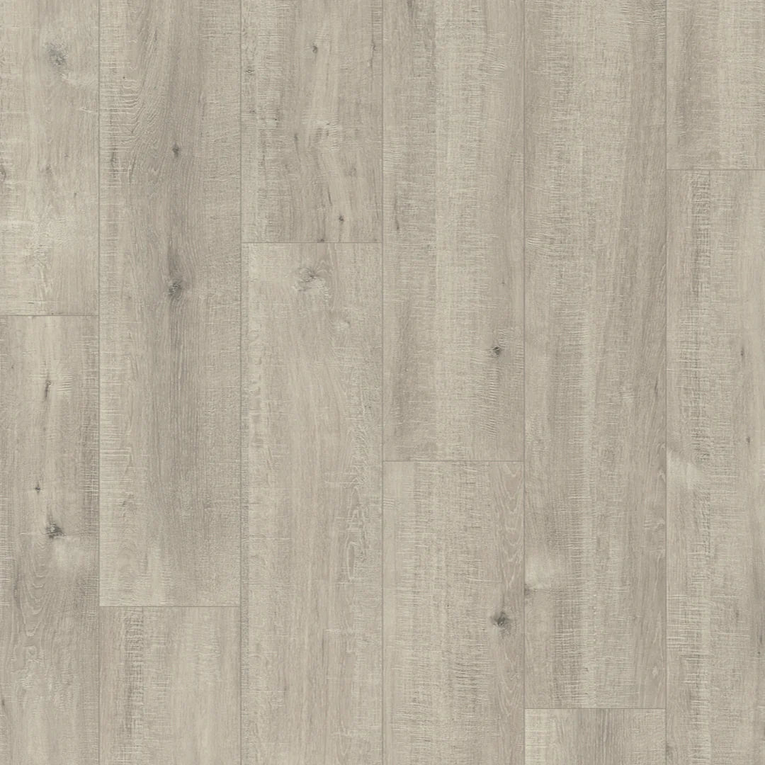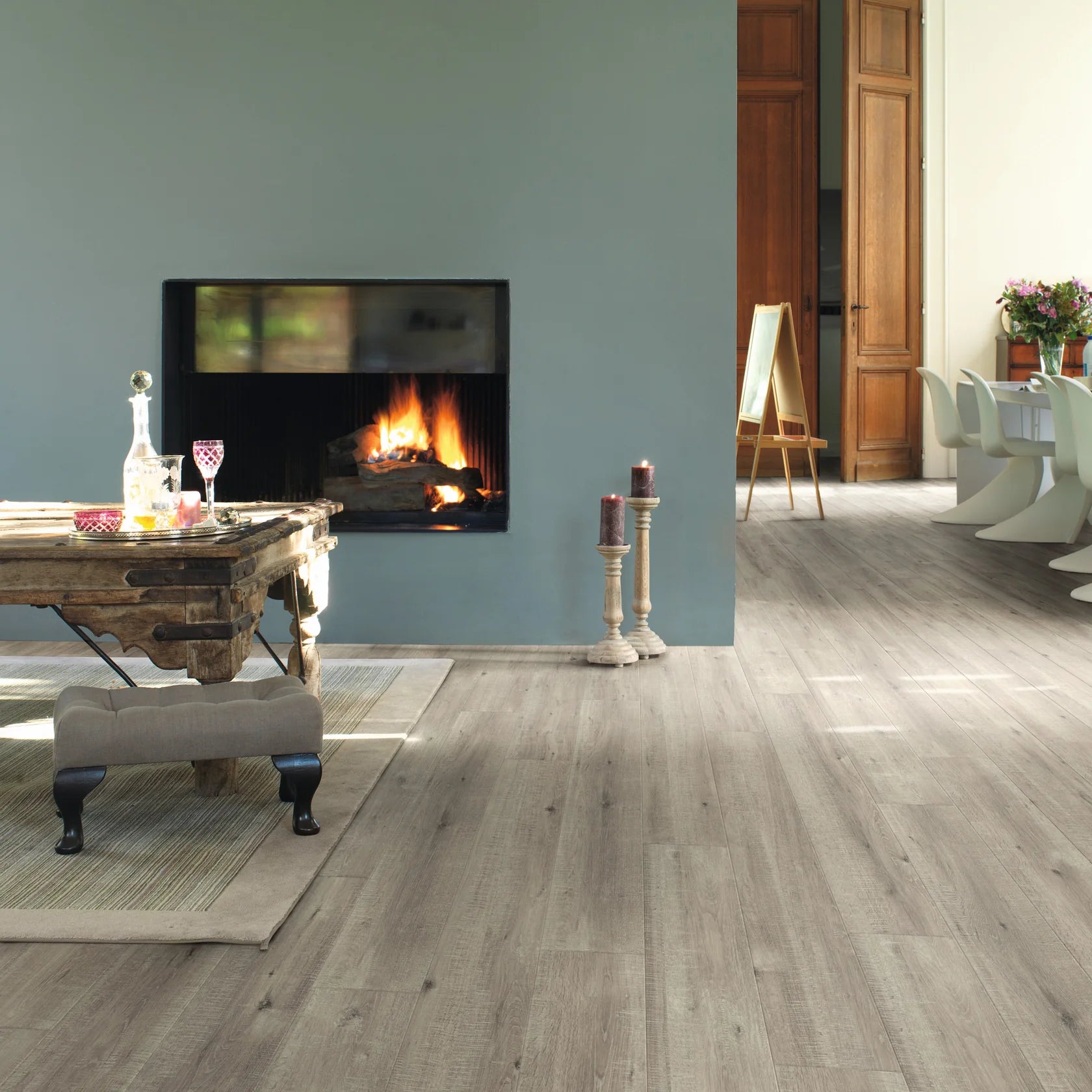 Quickstep laminate, grey oak flooring, durable laminate, water-resistant flooring, eco-friendly flooring, wood texture laminate, easy installation, saw cut oak, contemporary style, AC4 rating, floating floor system, Uniclic technology